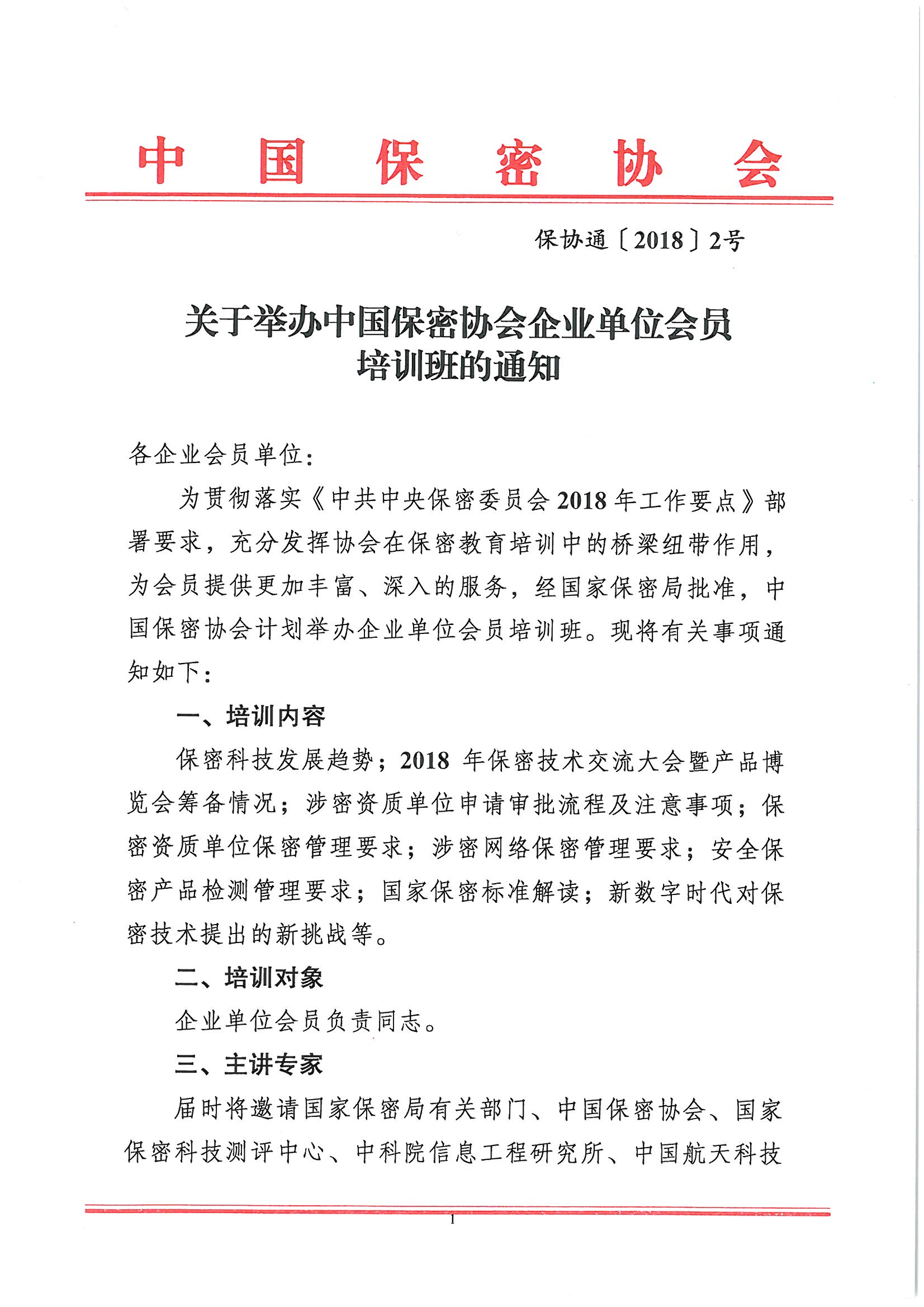 千呼万唤的企业单位会员培训班(免费)终于要在4月中旬跟大家见面了!为了更好地服务会员,解决大家最关心的保密科技发展趋势、保密资质、保密产品检测、保密标准等相关问题,协会精心设计了为期2天的培训,内容丰富充实,权威专家授课,欢迎大家报名。请注意以下信息。